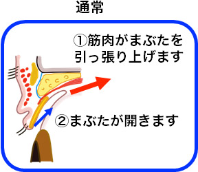 通常は、まぶたの奥にある筋肉が縮んでまぶたを引っ張り上げることで目が開きます。目を閉じる筋肉は別にあって交互に働くことで瞬きをしています。