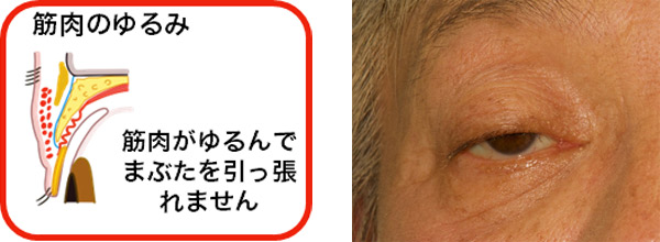 我々は毎日何万回もまばたきをしているため、年齢と共にまぶたを持ち上げる筋肉がゆるんできます。その結果、まぶたを持ち上げることができなくなります。これを眼瞼下垂(がんけんかすい)と言います。
